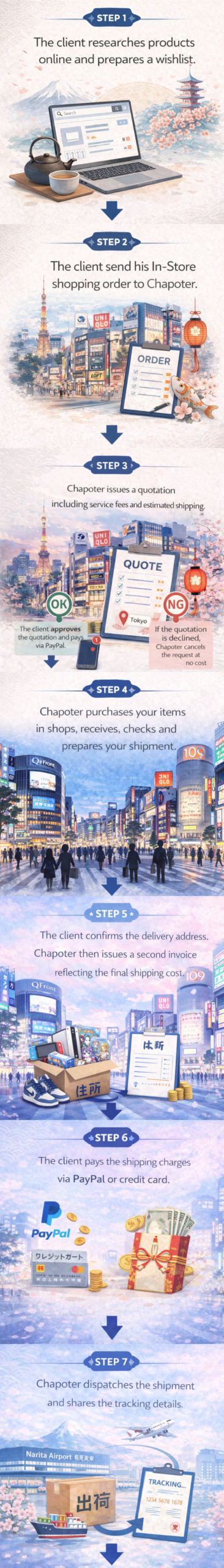 - Nous achetons directement dans des magasins physiques au Japon, y compris des boutiques limitées ou pop-up, puis organisons l’expédition.