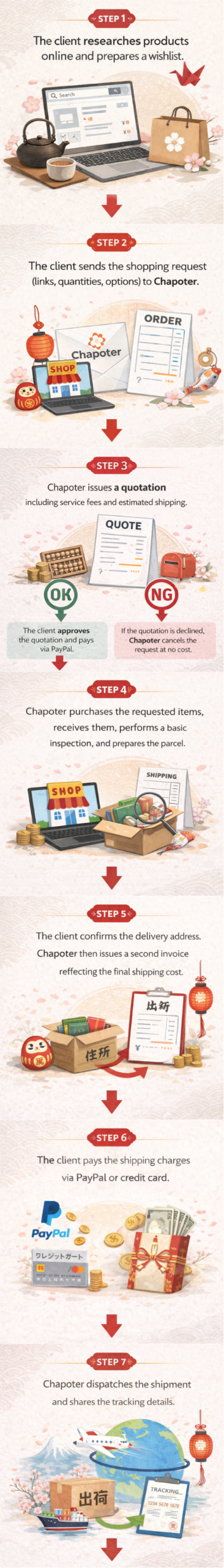 Nous proposons un service de conciergerie et d’achats basé au Japon, Nous sourçons des produits pour votre compte et coordonnons l’expédition internationale dans le monde entier en utilisant l’option Japan Post la plus appropriée selon la destination.
